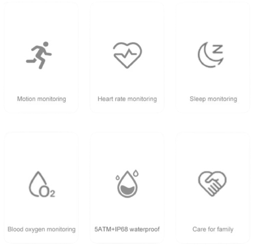 Motion, Heart rate, Sleep, Blood oxygen, Waterproof and Card